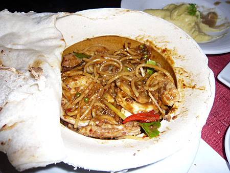 晚上有泰國朋友帶我去吃義大利餐+Health Land 按摩。有一道菜很有趣,不知各位看過沒? 這個叫: SPAGHETTI TOM YUM (酸辣意大利麵),左邊翻開的是蓋在鍋上的麵皮。