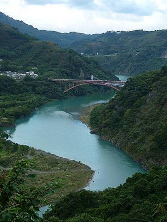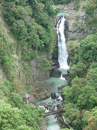 稍微逛了一下,吃了午餐,再往前幾公里就到小烏來了,指標很明顯並不難找。一過了小烏來風景區的牌樓,馬上就看到一個觀景台。景色真的很令人讚嘆,因為往左看,就是宣洩而下的小烏來瀑布;往右邊看,就是大漢溪以及通往羅浮村的有名的兩大景觀橋樑﹣﹣羅浮橋跟復興橋。