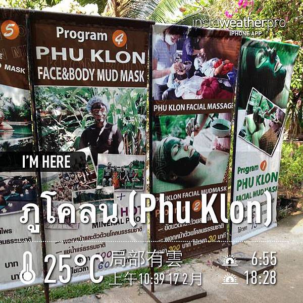 之後的行程較沒什麼,我們去了綿羊飼養場,似乎是在做品種改良實驗的,一堆羊放牧在草地吃草還任你拍照,而且可以摸;然後是草莓園,接著到 ภูโคลน/Phu Klon。這裡是自然泥溫泉,溫度有 60-140 度不等。到這裡可以做泥土敷臉的 SPA、溫泉游泳池、精油按摩、還有泡腳。我選了泡腳,只需花費 20 銖。其實就跟之前去礁溪泡腳池差不多,只是這裡水溫熱多了。工作人員都會提醒你,靜靜坐,腳不要亂動,不然會很熱。
