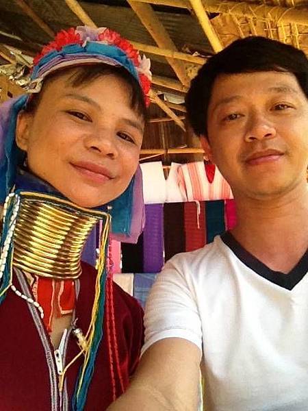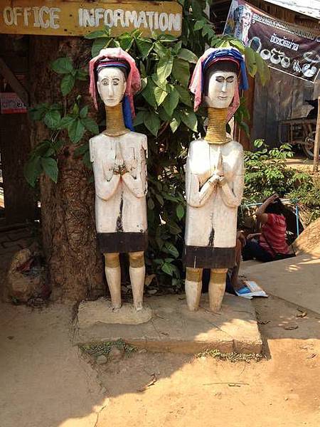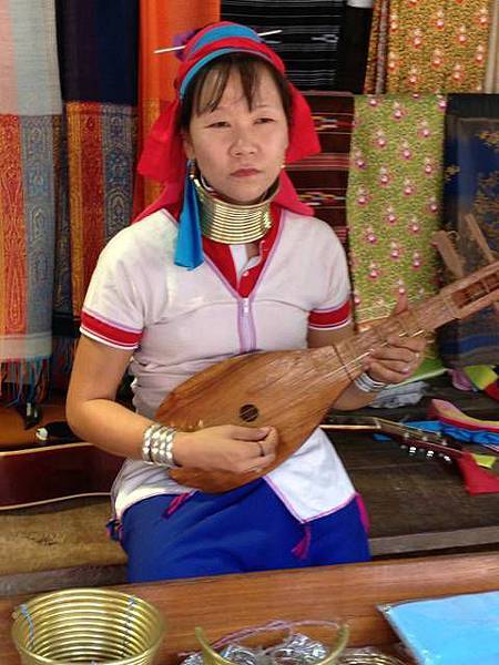 據說,長頸族原本住在緬甸,因為緬甸軍政府於 1988年成立,對他們迫害,使他們逃離至泰國至今。因為他們的難民身份所以他們不准在泰國工作,所以只能以自製手工藝品、茶葉、傳統衣服及包包,以及門票,來維持生活所需。我都會詢問可以照相嗎,以示尊重,她們其實都不會拒絕,就是準備好會要照相就是,當然,買些東西是小錢,就買一買回饋一下她們讓我拍照。她們告訴我說,她們五歲就會要戴那個銅圈,但其實現在沒有強迫,若女孩不願意戴,可以不用戴了,所以會看到一些跑來跑去的小女生並沒有戴銅圈。問說會不會痛?她們說倒是不會,就五歲剛剛開始戴時,會痛一點,之後就不會了。
