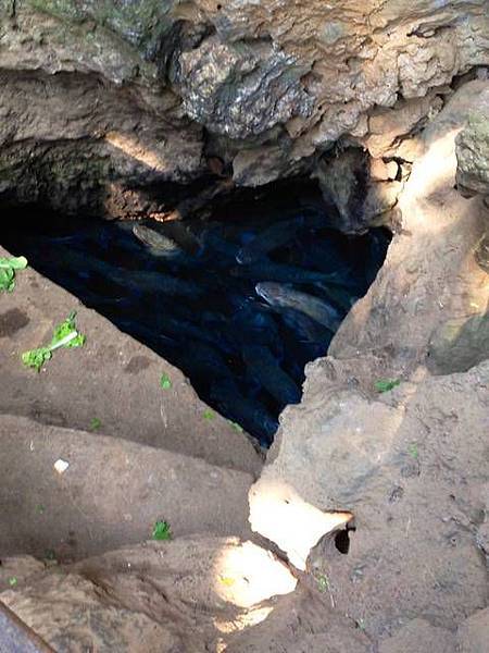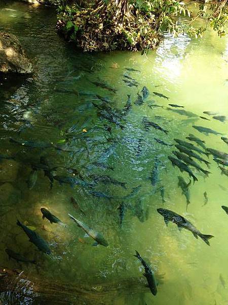 最後到魚窟 (Tham Pla/ถ้ำปลา)。顧名思義,這裡當然有魚有河,但妙的是,這些魚又大又肥,而且不知為何,都是自己游過來的,不是人工放養的,而且聚集一大堆。這條河,是在石灰岩下湧出的,一堆魚就擠在那水湧出口。相信就像洄游的魚類,牠們聚集在此是為了產卵,唯令人不解的是,從沒發現過這些魚倒底把卵產在哪裡?