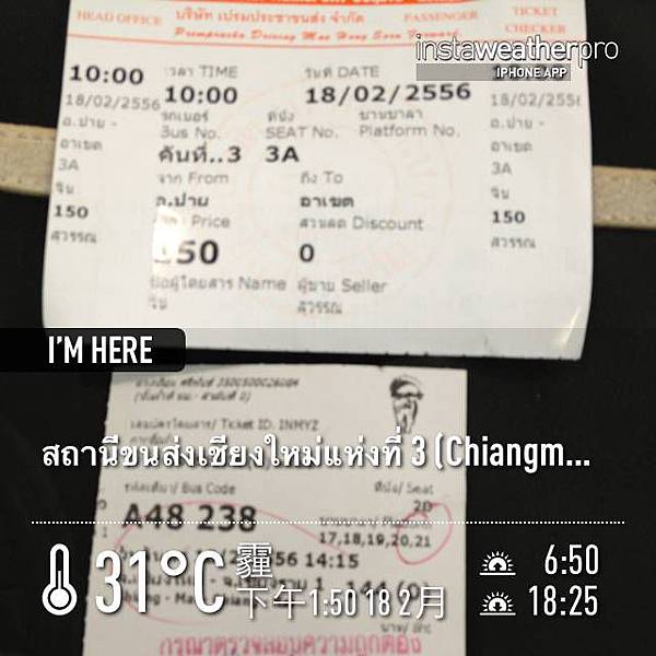 從拜縣到清邁要三個小時,也就是說,我中午一點十五分抵達清邁巴士第一總站 สถานีขนส่งผู้โดยสารเชียงใหม่ อาเขต 1/ChiangMai Bus Station Arcade 1)。清邁往清萊主要由 Green Bus 經營,由第三總站 (Arcade 3/อาเขต 3) 出發。很幸運,買到 14:15 出發的票。清邁巴士站第一、第二、第三其實都在同一處,過個馬路而已。清邁到清萊要三小時半,我於 17:45 抵達。所以,我除了在清邁等車一小時,今天共搭了快七小時的車,坐得腰痠背痛的。