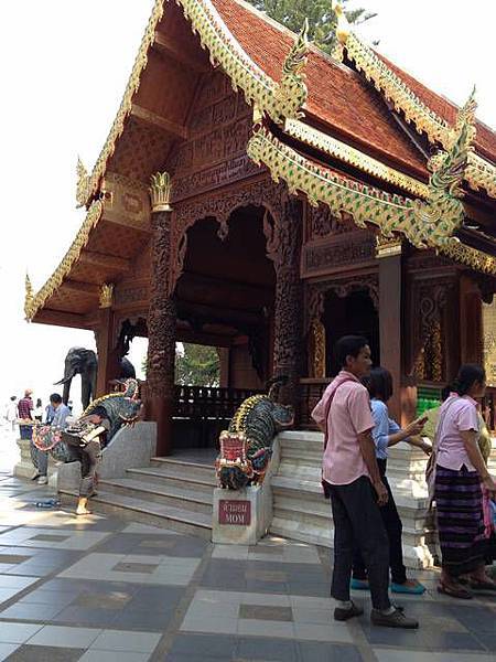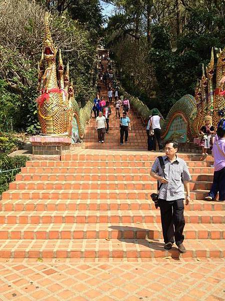 清邁的夜市,那條路叫 ถนนช้างคลาน (ChangKlan Road),字面義是「象爬路」。啊?大象會爬?這是個傳說啦,傳說中,為了安置佛祖的舍利子,人們將舍利子放在象背上,尋找建佛塔的吉地。結果象來到了這個素帖山,突然大叫起來,還跪下來爬行,最後死去。人們就在這裡,建了佛寺來安置舍利子,這是素帖寺的由來。至於為什麼又叫雙龍寺,那是因為爬上去的好漢坡樓梯,兩旁是兩條龍咩〜
