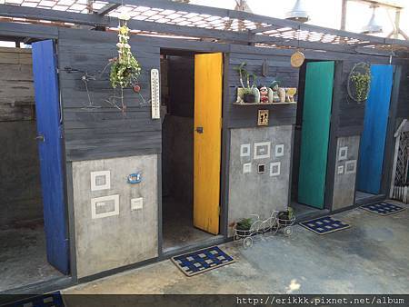 兩間藍色門是沖澡的;中間黃色門跟綠色門是上廁所的。