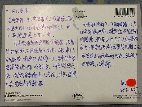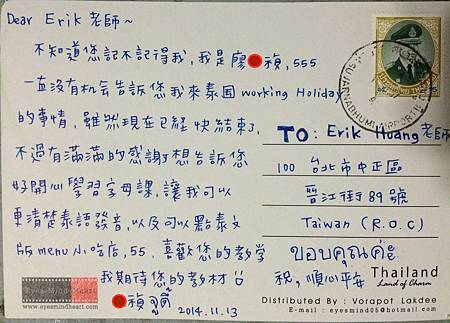 另一位廖同學,年紀輕輕可愛的小女生,沒想到居然跑去泰國 WORKING HOLIDAY 了兩個月!看不出來有夠大膽。今天收到她從泰國寄出的明信片,也特別意外!謝謝妳!