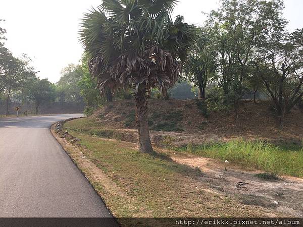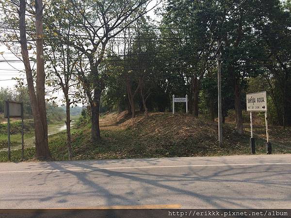 另外值得一提的是,有些容易會忽略掉的「土堤」,其實是城牆的遺跡喲!原本素可泰的城牆有內、中、外三層,以下照片可以看到右邊是中層城牆,左邊較遠的是內層城牆,馬路進去的點就是原本的北城門。