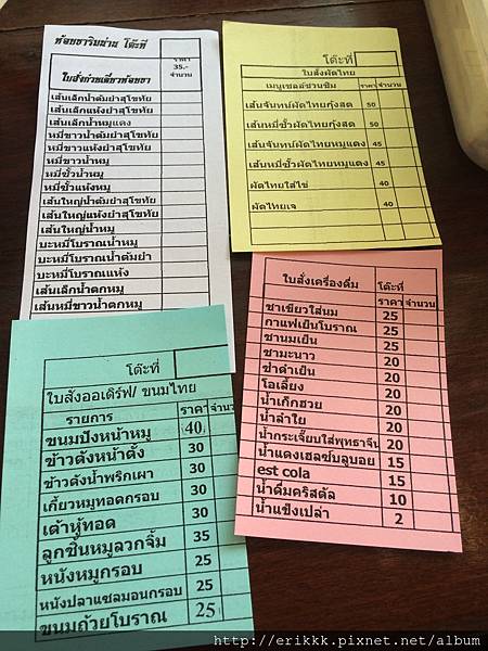 點餐分幾種顏色的單字,請注意喲:(1)黃色單是炒河粉類 (ผัดไทย Pat thai) (2)白色是粿條類 (ก๋วยเตี๋ยว) (3)綠色是點副食及甜點 (ออเดิร์ฟ/ขนม) (4)粉紅色點飲料 (เครื่องดื่ม)。沒有英文噢!如果各位看不懂泰文,那我覺得就隨便劃吧!也很刺激!反正價格很便宜,而且份量不多。