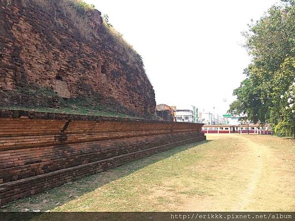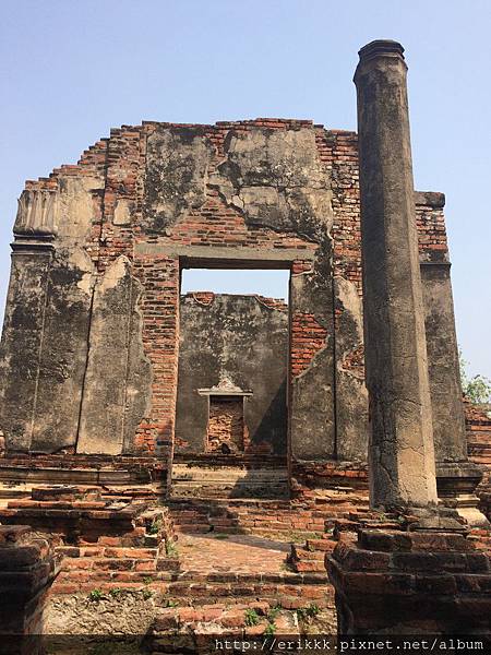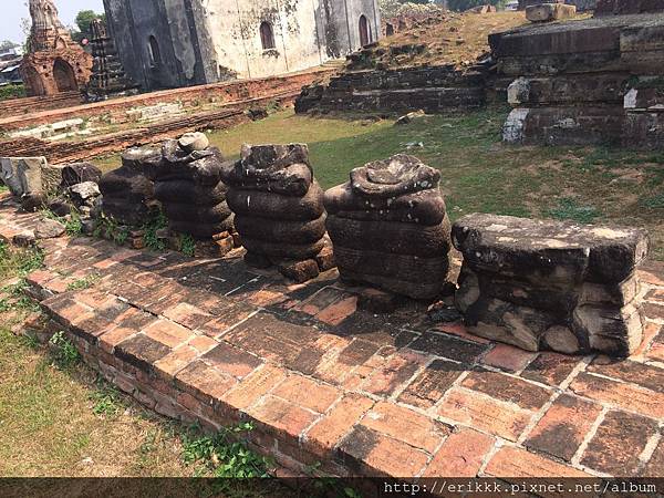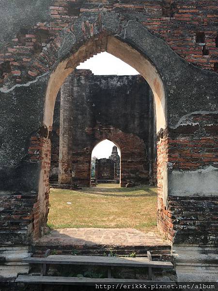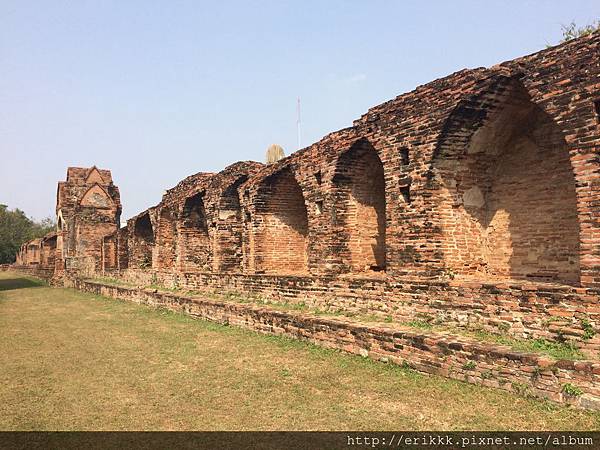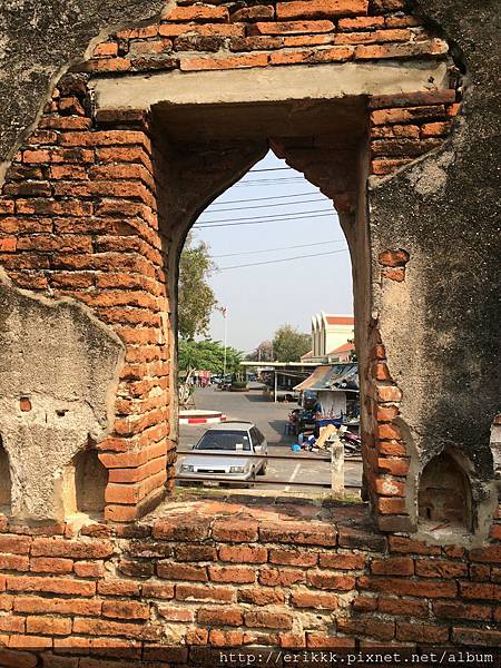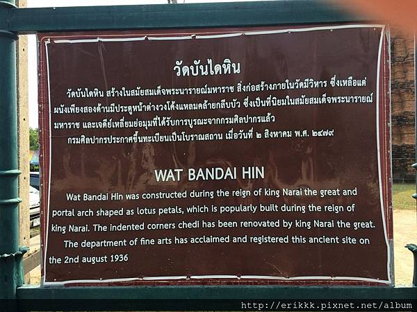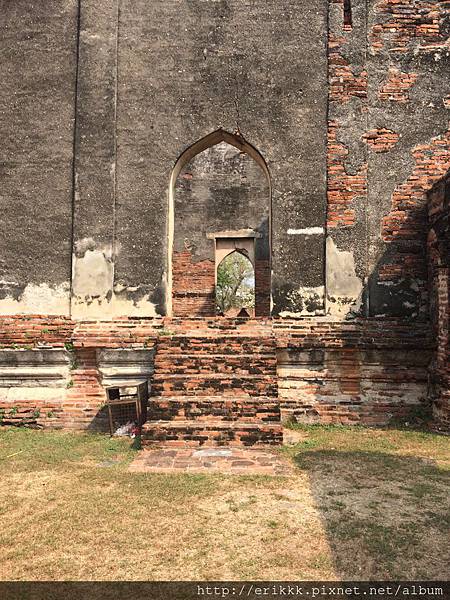 首先,我來到「石梯寺」 วัดบันไดหิน (Wat Bandai Hin),就在火車站左側。我首先注意到窗戶,都是蓮花形,跟別的地方不一樣!後來得知,這種造型的窗戶,是那萊王時期的藝術特色。後面幾個古蹟,也都是蓮花形的窗戶。