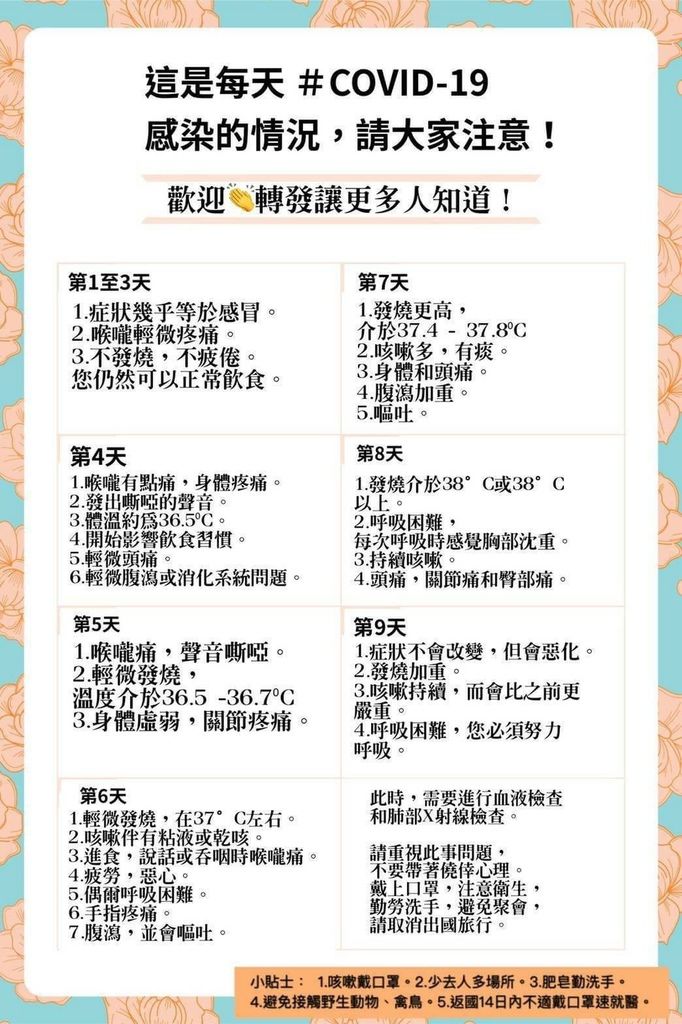 補充提醒:每一個患者的情況其實不太一樣,也不一定都會按照這個時間、這個次序發生。還請大家要多注意自己,是不是出現了類似下列的症狀喔!祝大家健康平安。
