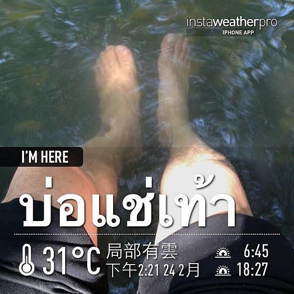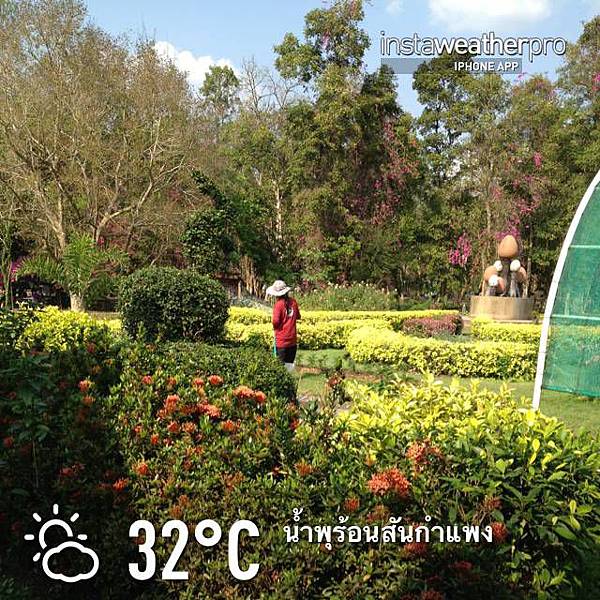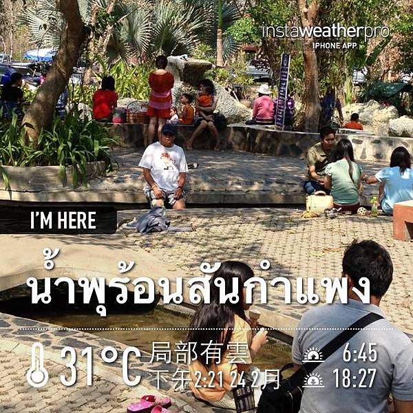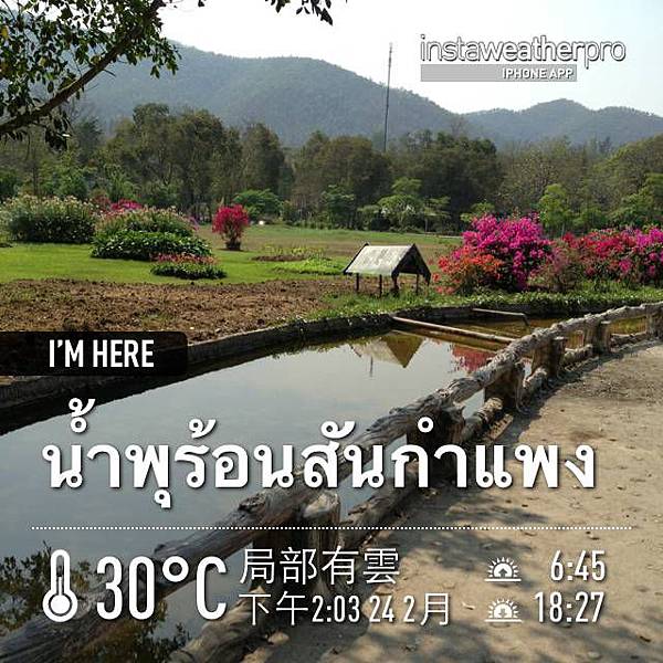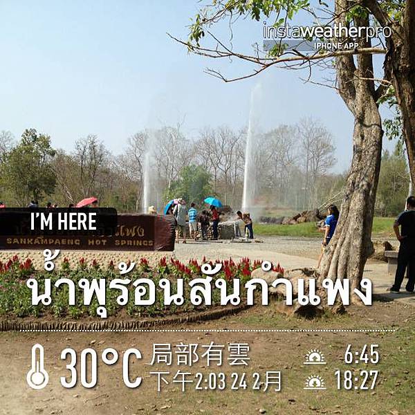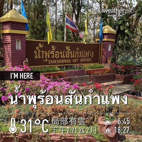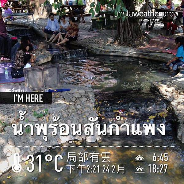入場費:泰國兒童10銖;泰國成人跟外國人兒童 20銖;外國成人 40銖。裡面是還不錯的溫泉公園,除了景觀的花草樹木造景之外,還有一條人造溫泉溪,遊客可坐在兩邊排排坐下泡腳、聊天。還有兩處自然噴泉,有點像美國黃石公園那樣。由於溫泉溫度有 105 度,因此有圍起來,遊客只能遠觀,不可褻玩。(咦?好像用錯地方)聽說,其實噴泉是有間歇性的,但為了遊客,所以他們裝了幫浦,讓它可以一直噴。既然水溫有 105 度,那麼就一定也有「煮溫泉蛋」這種遊戲囉!