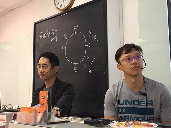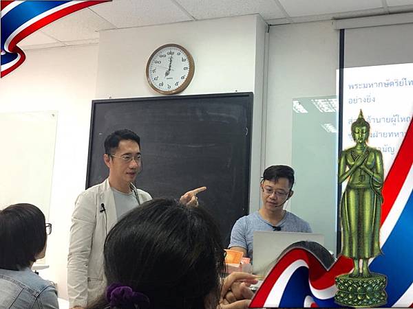 每年有兩次,都會請曾任泰國朱拉隆功大學泰語系的阿南教授 (Dr. Anant Laulertvorakul) 來台灣幫我們授課一個月。因為語言的問題,我們身為老師的要當現場口譯。而我這一次負責的科目是「泰拳」、「泰國九世皇」。